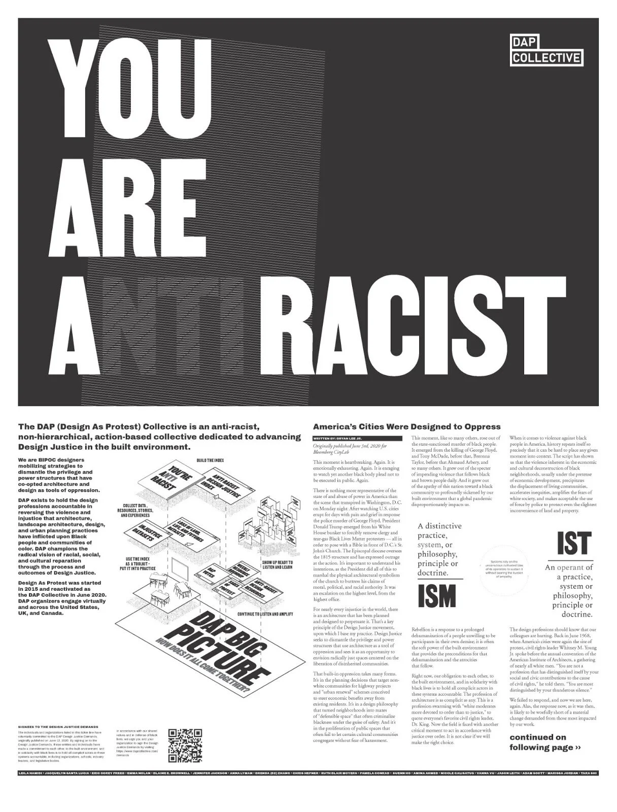 The newspaper is a tool to help put the Anti-Racist Design Justice Index into action, complete with case studies, a deep dive into how to use the index paired with scenarios and guiding questions, and how-to guides. It serves as a widely accessible resource for those in practices, professional organizations, local government, academic institutions as well as grassroots organizers, students, and more. It is also a launching point for our DAP Affiliates program.